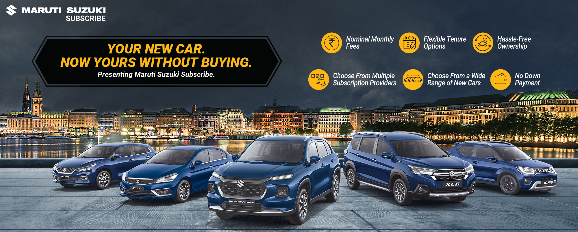 Maruti Suzuki Subscribe enables all customers to enjoy driving their preferred Maruti Suzuki cars without having to deal with all the financial responsibilities that come with owning a car.All you need to do is opt for a monthly subscription plan at a fixed monthly fee, which includes the routine maintenance and insurance costs, and choose a flexible tenure. At Akanksha Automobiles in, Amroha, Sarai Kona Amroha, all Hatchback, Sedan, SUV, the MUV models line-up includes Baleno, Invicto, EVitara, Jimny, Ciaz, Ignis, Fronx, Grand Vitara, XL6. Here, you will enjoy Maruti Suzuki Subscribe benefits such as: